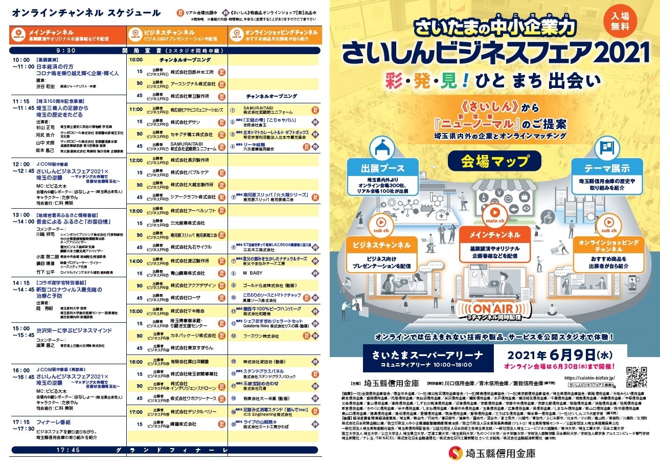 当日は、さいたまスーパーアリーナを「さいしんビジネスフェア2021」リアル会場として、公開スタジオからのLIVE配信や、オンラインでは体感できない埼玉発の技術や製品・サービスをリアルに体験できる展示会を、新型コロナウイルス感染症拡大対策を十分に行い実施いたします。また会場の模様は、メイン+ビジネス+オンラインショッピングの3チャンネルを開設して当日オンエアいたしますと共に、翌6月10日(木)からはアーカイブ配信をしてまいります。
