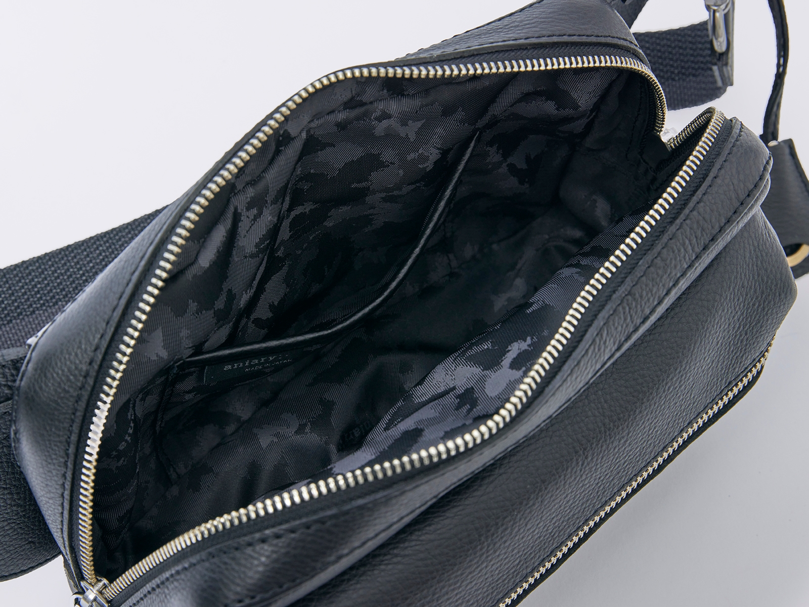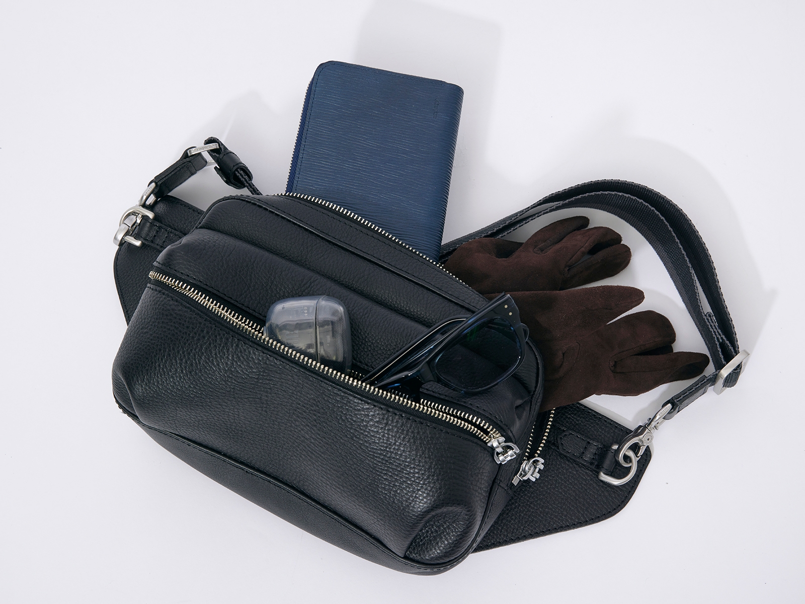 鞄のポケットに入れたモノの出し入れ回数が多いなら、開閉が楽な横型のボディバッグがおすすめ。こちらは、シュリンク・レザーの柔らかい特性を活かしながら、さらに身体にフィットするよう、内側に1枚革をあしらっています。