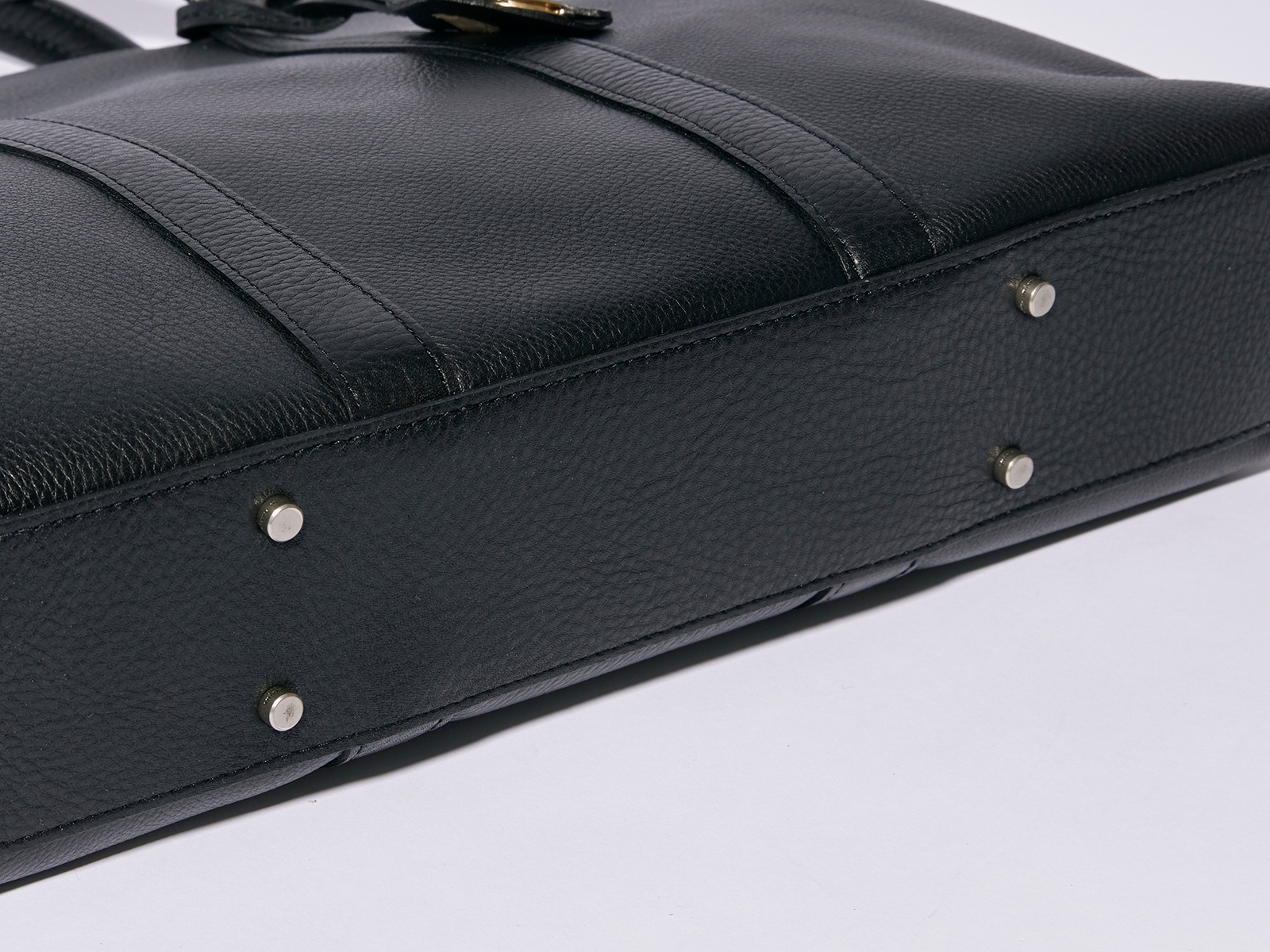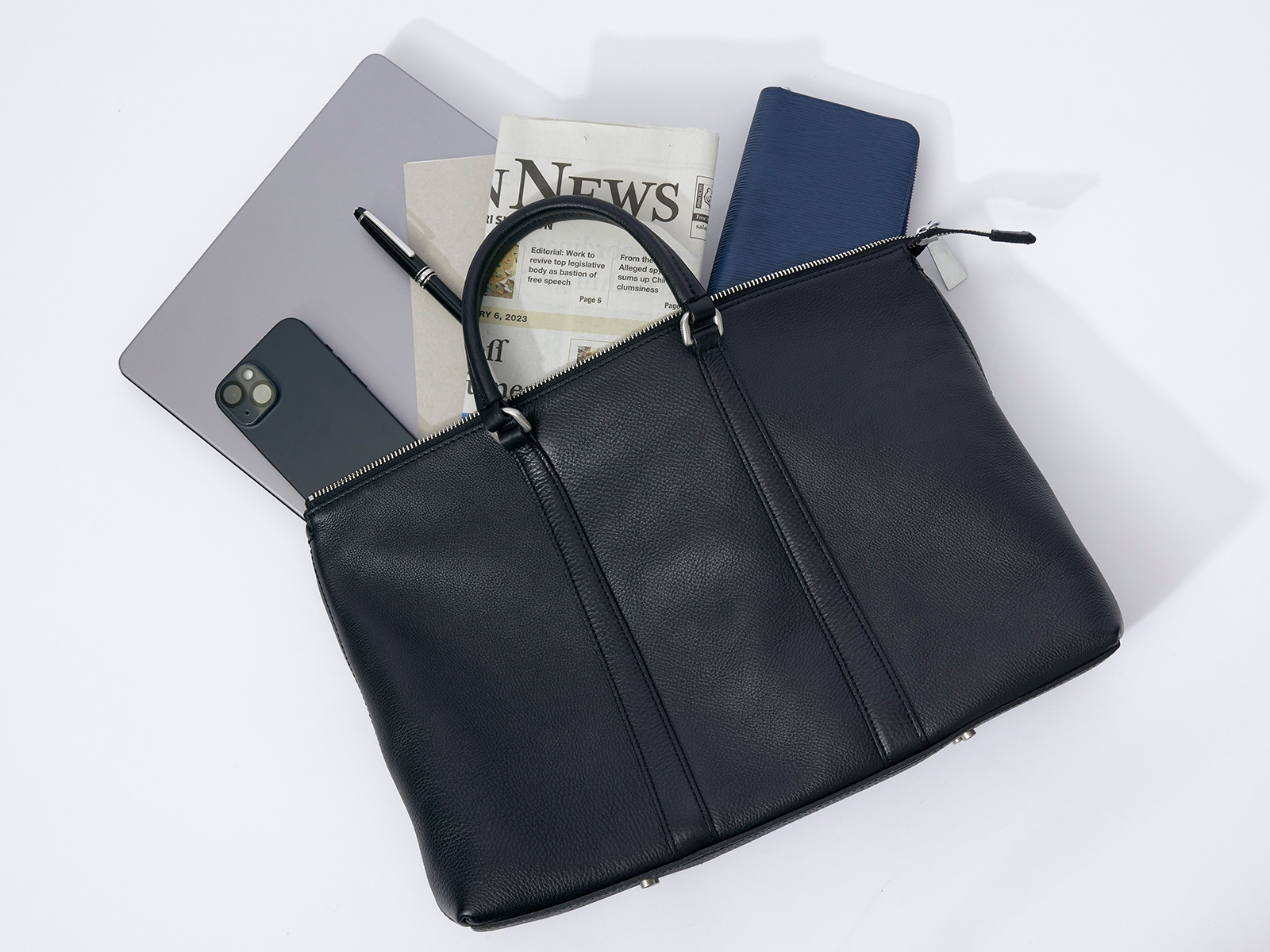 ブリーフバッグは、デザイナーが“極めてシンプルフォルム”をテーマにデザインしており、そぎ落としの美学が生きて、結果、オン・オフ問わず使える雰囲気に仕上がっています。ポケットも無駄にあれこれつけず、左右を少しカーブさせ出し入れをしやすくしたあおりポケットのみをデザインに組み込んでいます(※内側に別途ポケットはあり)。