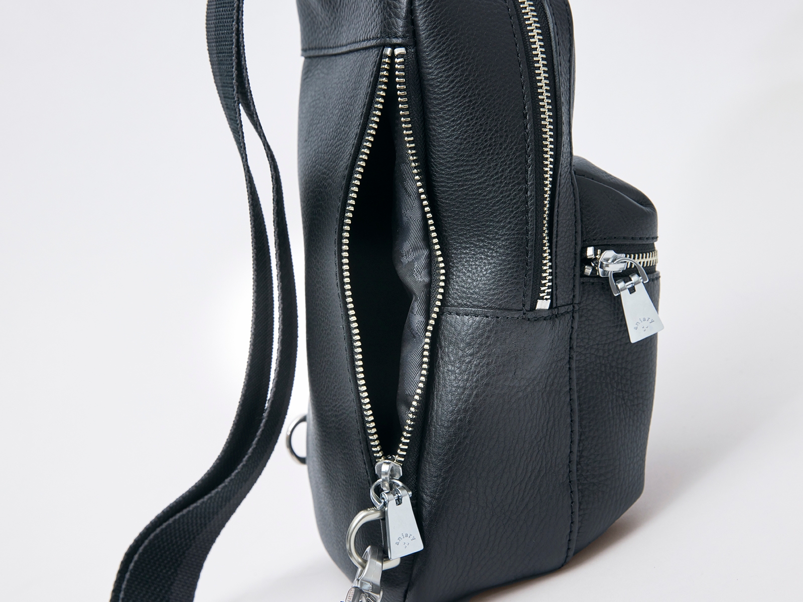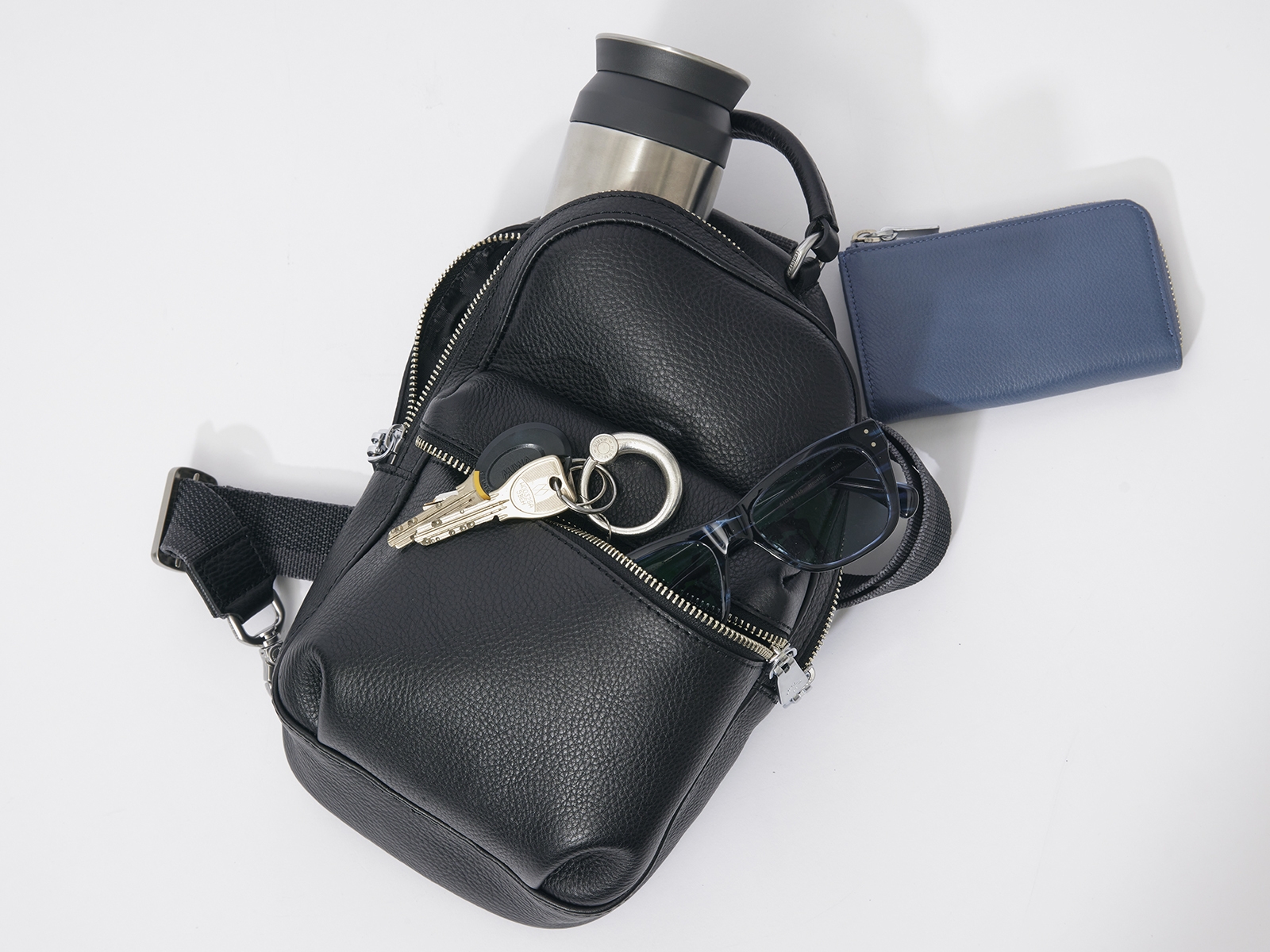 一方、新型のボディバッグ2アイテムは、どちらもファスナー式のアウトポケットがアイコニック。こちらは、そのアウトポケットの底にタックをいれて革をつまむことで、荷物を入れても入れなくても、いつでもシルエットがすっきりシャープに見えるよう設計しています。