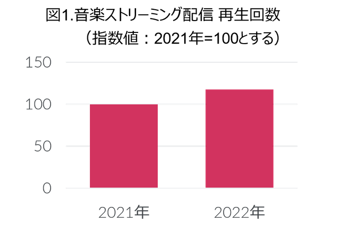 音楽ストリーミング配信市場は、伸長率が下がっているものの2022年の再生回数は前年の18%伸長となり、ストリーミング利用は堅調に増加傾向となった(図1)。