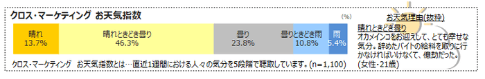 クロス・マーケティングお天気指数とは、直近1週間における人々の気分をお天気で表したものです。お天気の理由も一部抜粋してお知らせします。