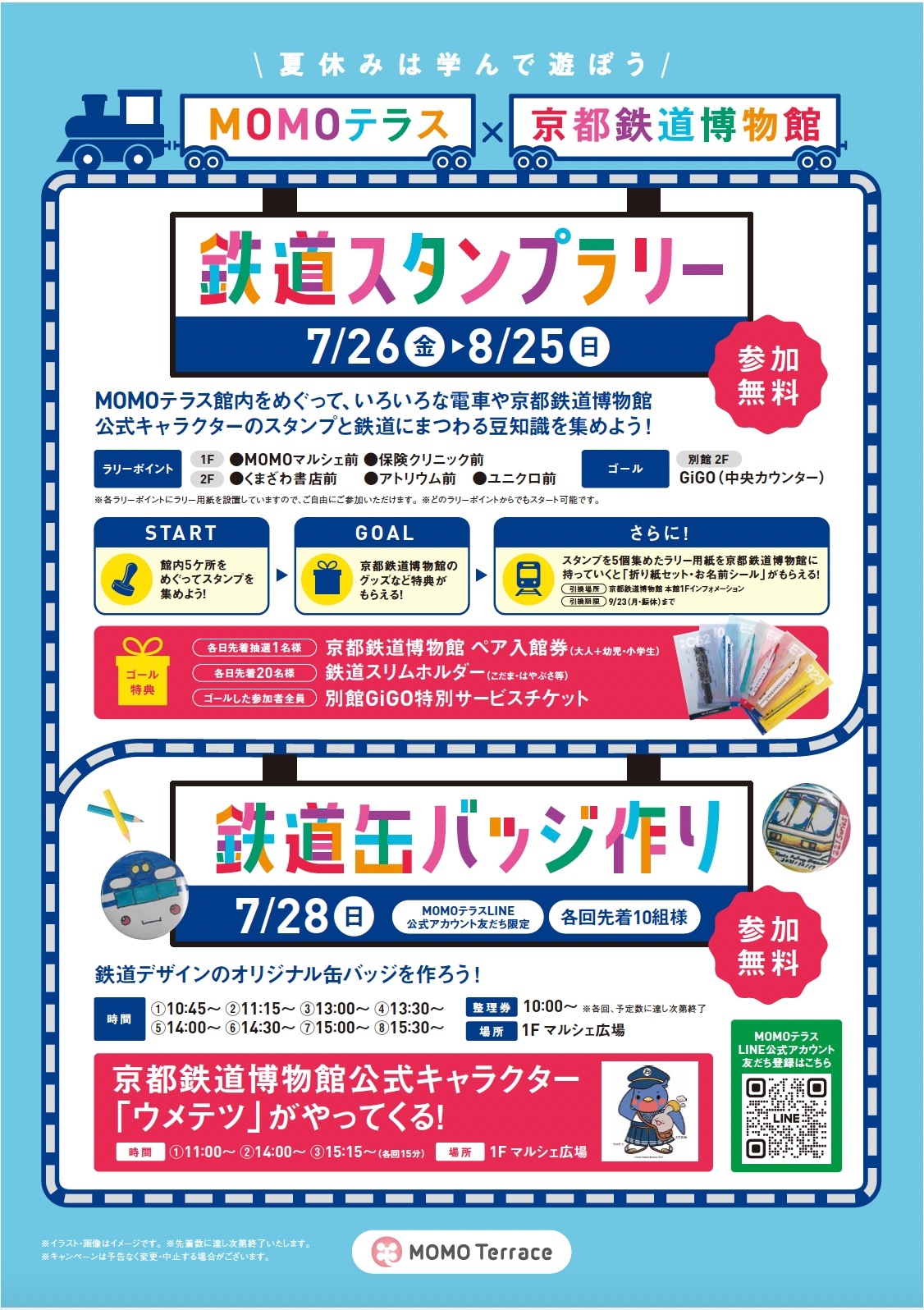 MOMOテラス×京都鉄道博物館 初のコラボで夏休みイベントを開催 ~鉄道スタンプラリーや缶バッジ作り、 ウメテツと記念撮影まで【参加無料】~