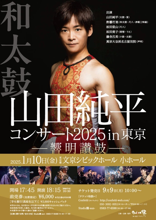 株式会社Studio燦 主催・企画・制作、響明讃鼓『山田純平コンサート2025 in 東京』が2025年1月10日 (金)に文京シビックホール 小ホール(東京都文京区春日1丁目16-21)にて開催されます。