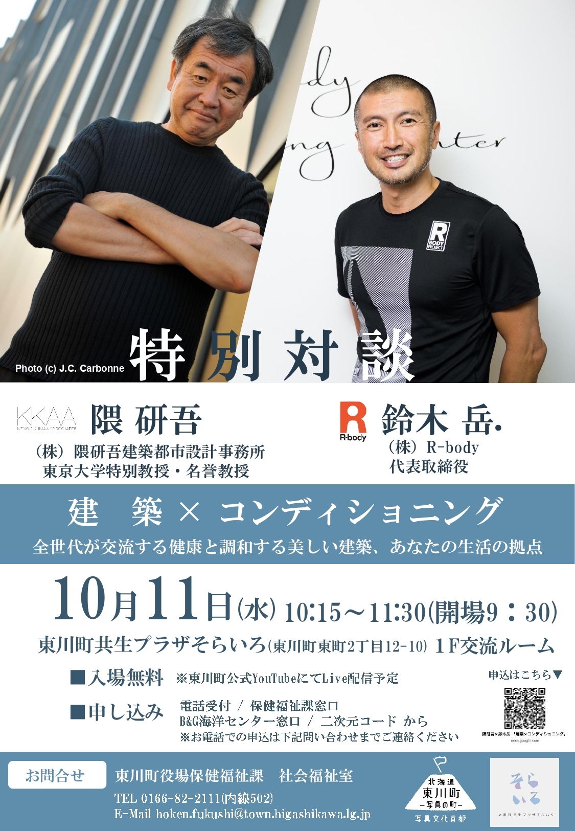 北海道東川町では、10月11日(水)10:15より、東川町共生プラザそらいろにて、「東川町共生プラザそらいろ」の開館を記念して当施設のデザインを監修した世界的建築家・隈研吾氏と東川町オフィシャルパートナーとして町民の健康づくりをサポートしている、R-body鈴木岳.氏による特別対談を開催します。