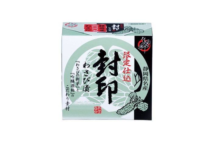 「わさび漬 封印」は、静岡県産のわさびを贅沢に使用した逸品です。若い新芽からは爽やかなわさびの香りを、根からは鮮烈な辛さを引き出し、それらを最高級吟醸酒の酒粕と漬け込むことでわさびの魅力をぎゅっと封じ込めており、受賞時の評価ポイントの一つにもなっています。