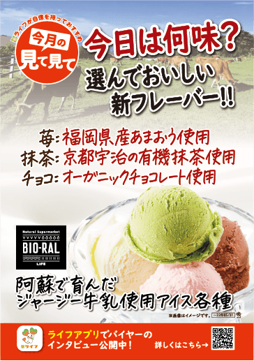 ライフが自信を持っておすすめする「今月の見て見て」の首都圏5月商品に選ばれた「BIO-RAL 阿蘇で育んだジャージー牛乳使用アイス」は、乳化剤・安定剤・香料を使用せずに作った体に優しい味わいで一口目から濃厚なミルクの風味が広がり、お客様から「おいしい!」とご好評をいただいております。より多くのお客様に選ぶ楽しさをお届けしたいという思いから、人気の高い”苺・チョコ・抹茶”の新フレーバーを開発いたしました。すべて素材にこだわった自信作です。