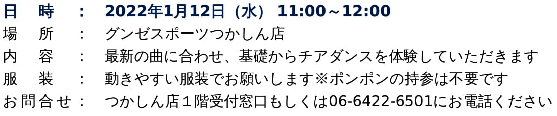 グンゼ株式会社(本社:大阪市北区、社長:佐口 敏康)の連結子会社であるグンゼスポーツ株式会社(本社:兵庫県尼崎市、社長:西村 仁宏)は、1月からつかしん店にて、話題の成人チアダンス「オトン・オカンチアダンススクール」のメンバー募集を開始いたしました。