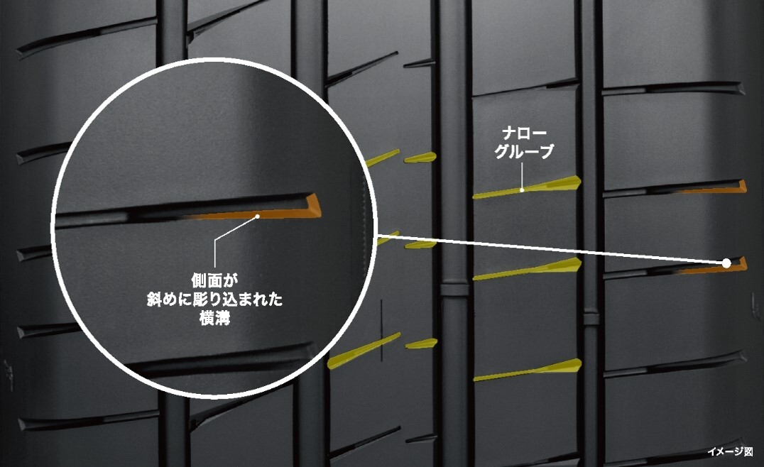 リブセンターの横溝を従来品より細かくしたことで共鳴音を低減。また、ショルダー部にチャンファー(面取り)を入れて接地面とのたたき音を緩和しています。