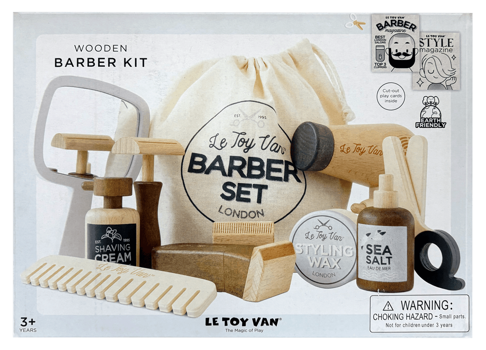 特長 : 木製の床屋さんセット。くし、ドライヤー、はさみなどのアクセサリーが含まれ、子どもたちが理容師になりきって遊べます。ヴィンテージスタイルの収納袋付属。