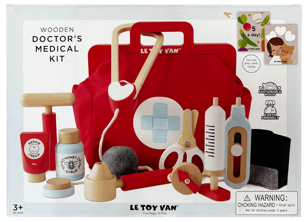 特長 : お医者さんごっこが楽しめる木製のドクターキット。おもちゃの医療用具9点がセットになり、子どもたちの創造力を育みます。ヴィンテージスタイルのバッグ付属。
