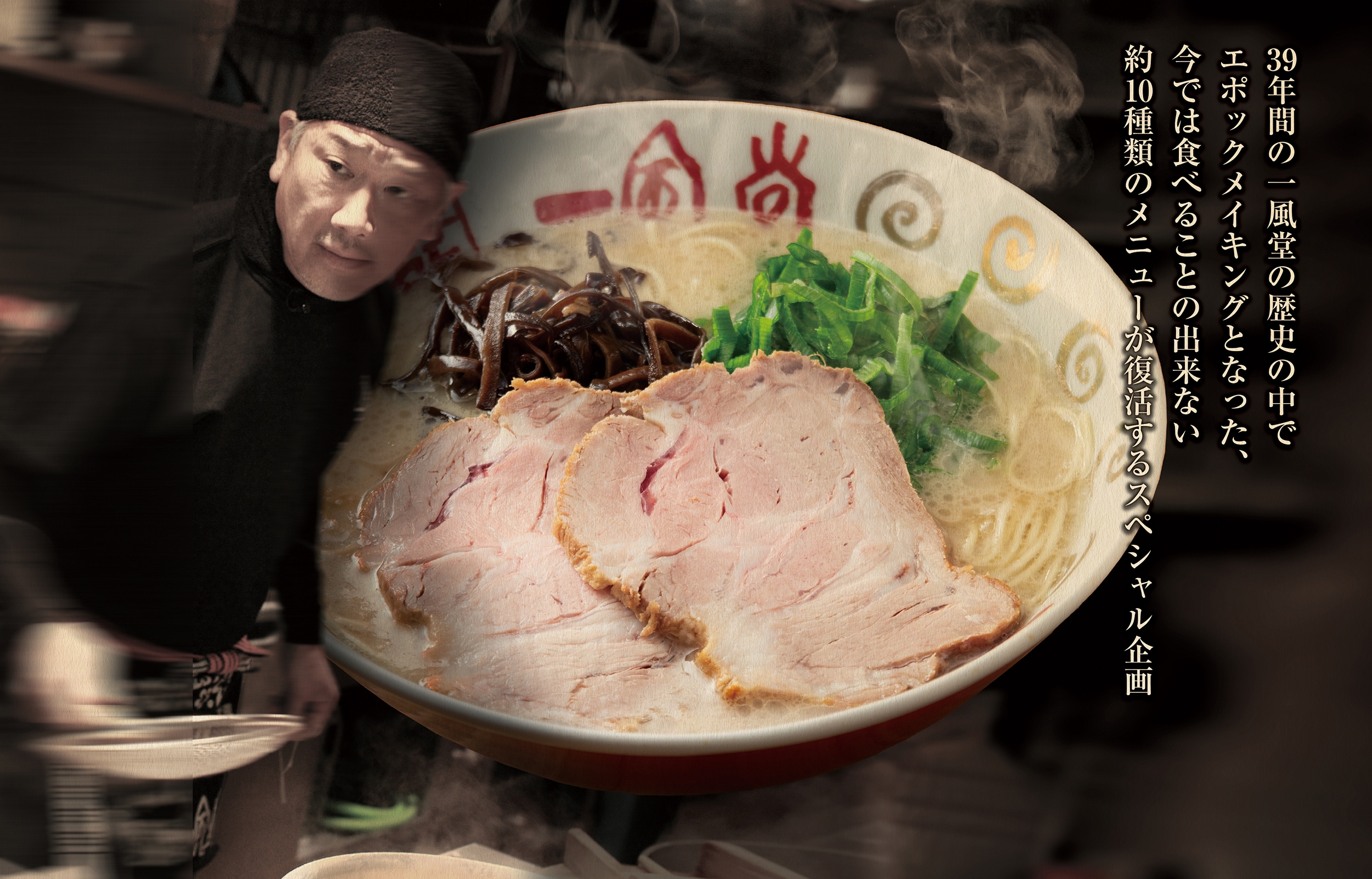 さらに今年39年目に突入した一風堂ですが、39年をThank youととらえ、これまでの感謝と共に一風堂の歴史の中でエポックメイキングとなったメニューを歴史と共に振り返る“一風堂クロニクル”というテーマを付加し、約3ヶ月の期間の中で様々なメニューが復活します。