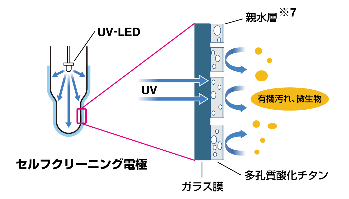 電極に光触媒(多孔質酸化チタン)をコーティング※5すること、また電極にUV-LEDを内蔵※6することで、pH電極としては世界初の防汚技術※1を実現しました。多孔質酸化チタンでコーティングしたガラス膜の表面に、電極内部からUV-LED光を照射します。多孔質酸化チタンが光に反応して、電極外部に付着した有機物(オイル、多糖類、微生物など)を分解し、防汚効果が生まれます。これにより、メンテナンス頻度を大幅に削減し(数値は以下用途例に記載)、本製品の使用によるメンテナンス工数を最大約99%※3削減します。