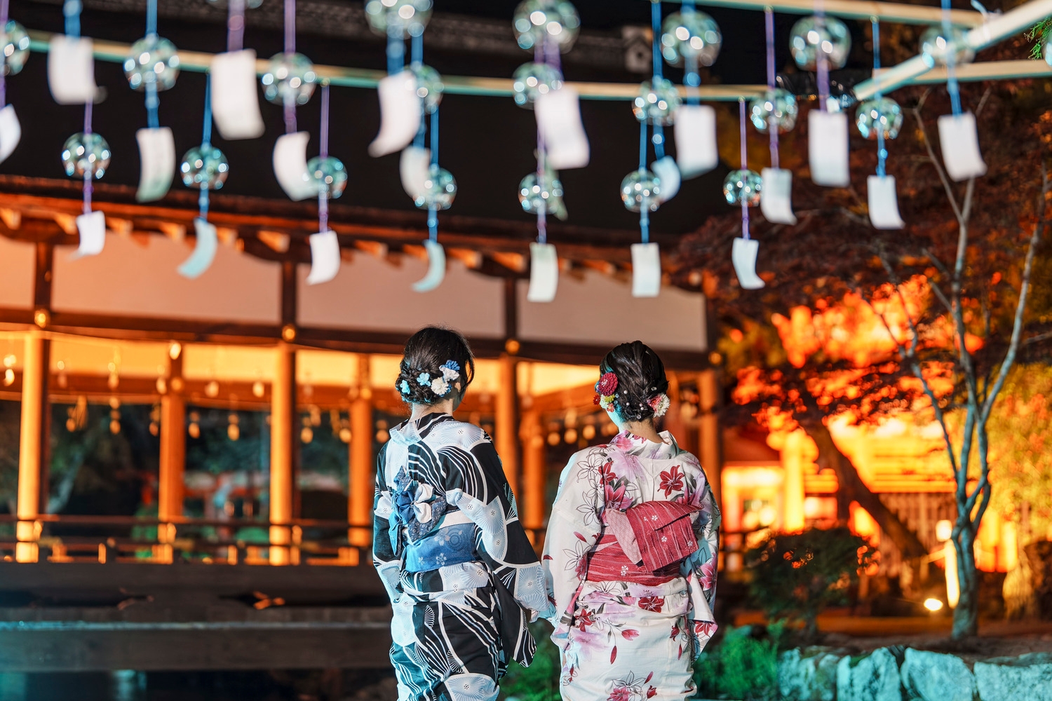 境内を飾る1,000個以上の風鈴の音色、青やグリーンを基調とした涼やかな光で夏の夜を演出。境内を流れる清流「ならの小川」に足を浸すこともでき、心身ともに清められ、夕涼みならではの風情を体感することができます。川にかかる橋殿では、水の神へ奉納される神秘的な巫女舞「賀茂の舞」、篠笛の奉納演奏なども行われます。日中とはまた違う、夏の夜のひとときをお過ごしください。