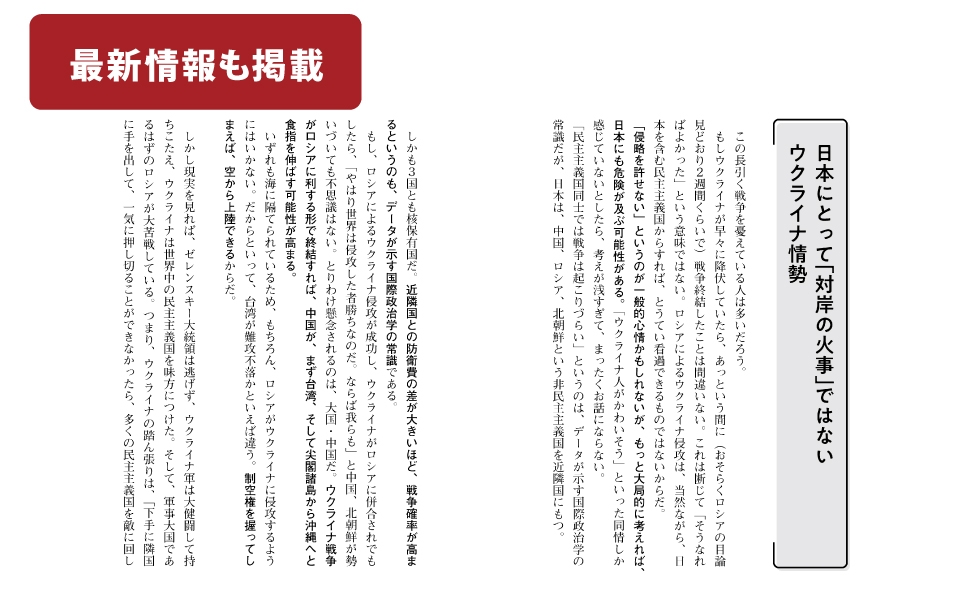 国際関係が目まぐるしく動いているなかでの執筆となった。 なるべく最新の情報を盛り込むべく、校了のギリギリまで原稿に手を入れたが、 校了から刊行までには多少、時間がかかる。 おそらく、その間にさらに事態は動いているだろう。 本書で追いきれなかった点はご容赦いただきつつ、 ぜひとも自分で考えてみてほしい。 井の中の蛙を脱し、真にグローバルな視点から、 まっすぐに、鋭く、今、自分が生きている世界のありようをとらえる。 本書が、そのきっかけとなれば幸いである。