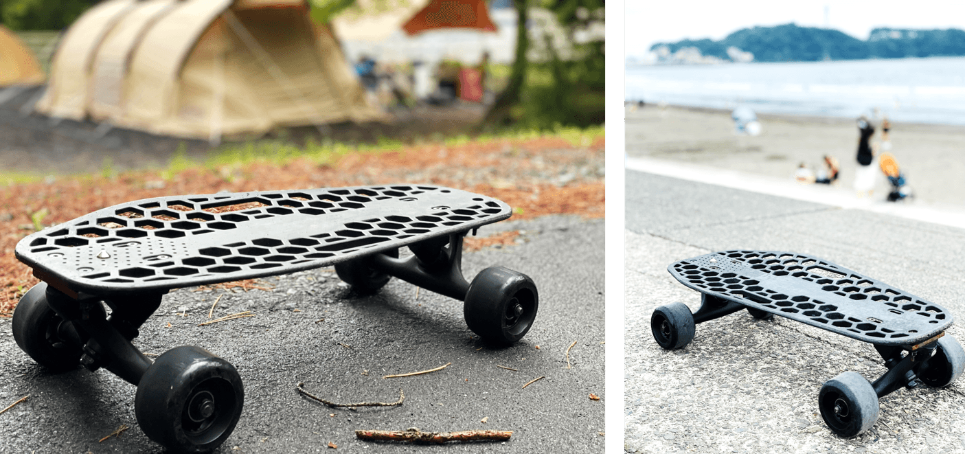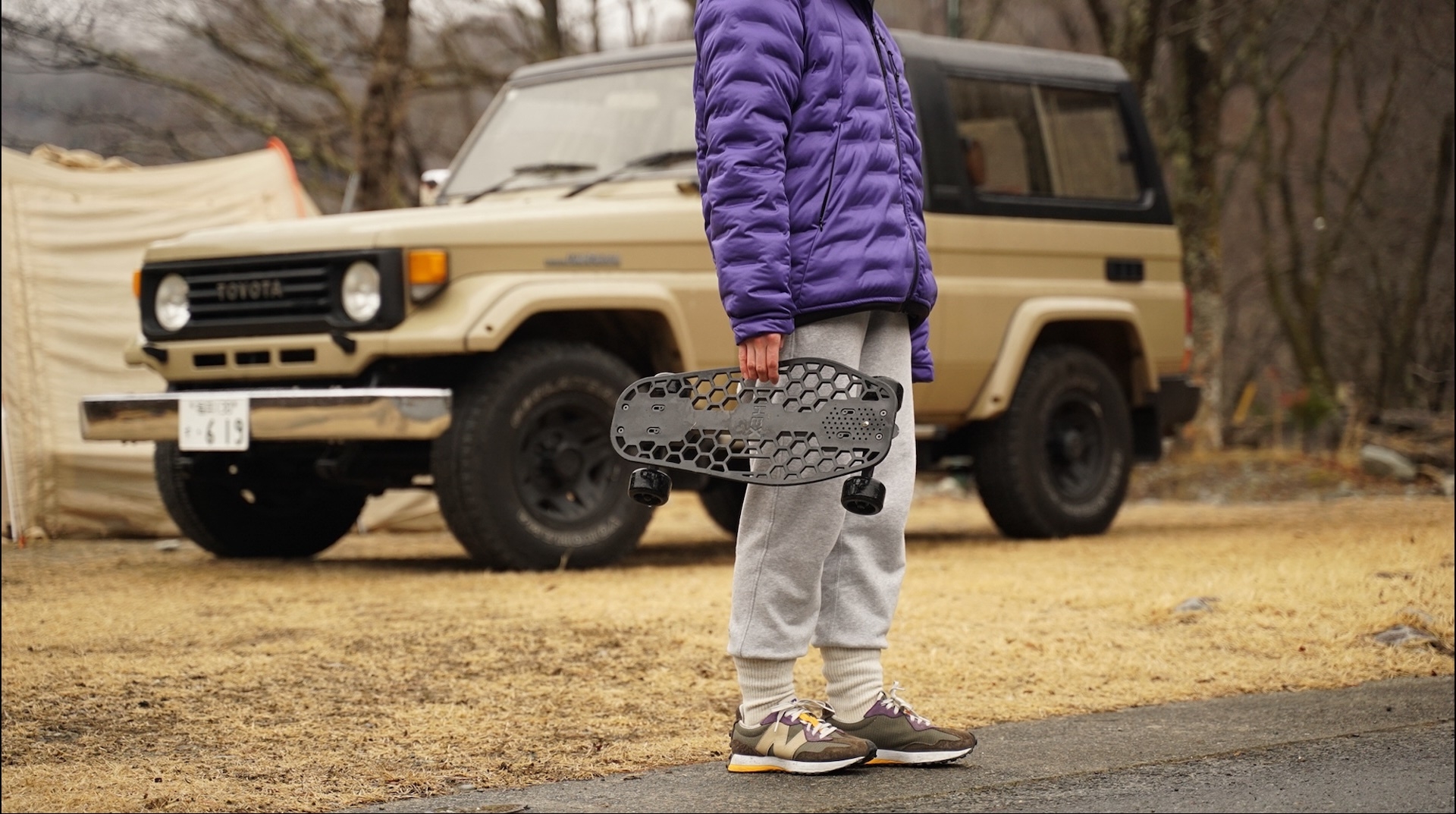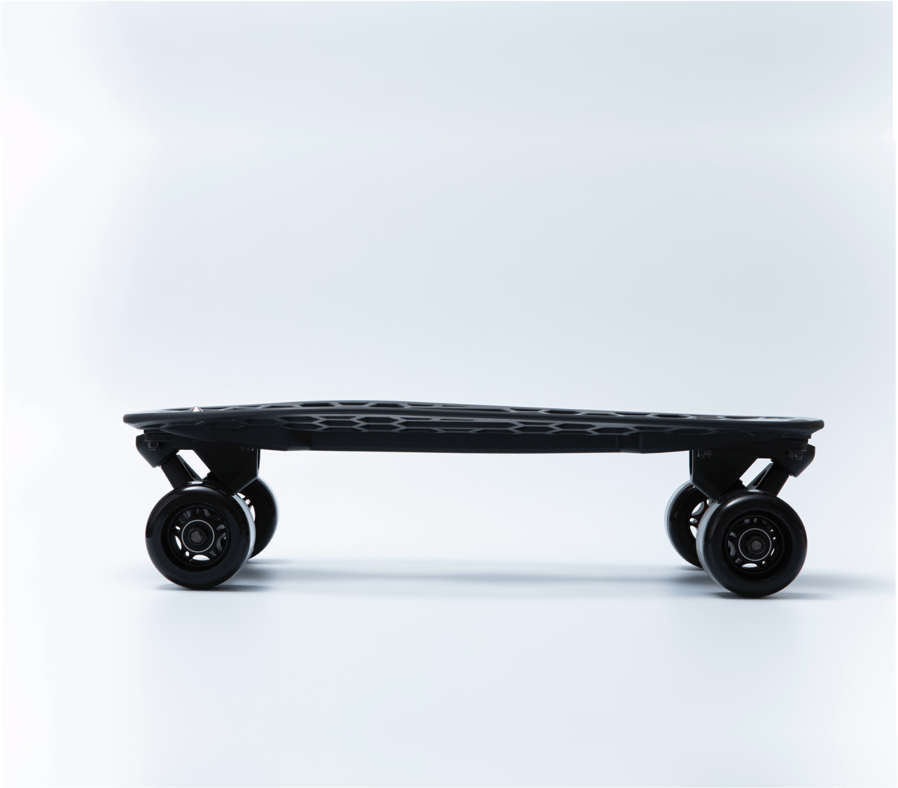 HEXは重心を取りやすい特殊構造(前にしか進まない構造)と乗りやすい幅、奥行きを維持しつつ六角格子構造のボードにすることで、軽量化と強度を両立しています。