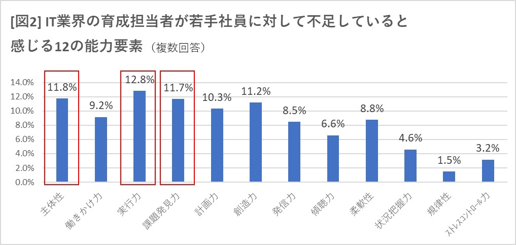 当社が独自におこなったアンケート調査によると、経済産業省が2006年から提唱している社会人基礎力「12の能力要素」のうち、IT業界の育成担当者が若手人材に求める能力・不足していると感じる能力はいずれも、第1位:実行力、第2位:主体性、第3位:課題発見力でした。