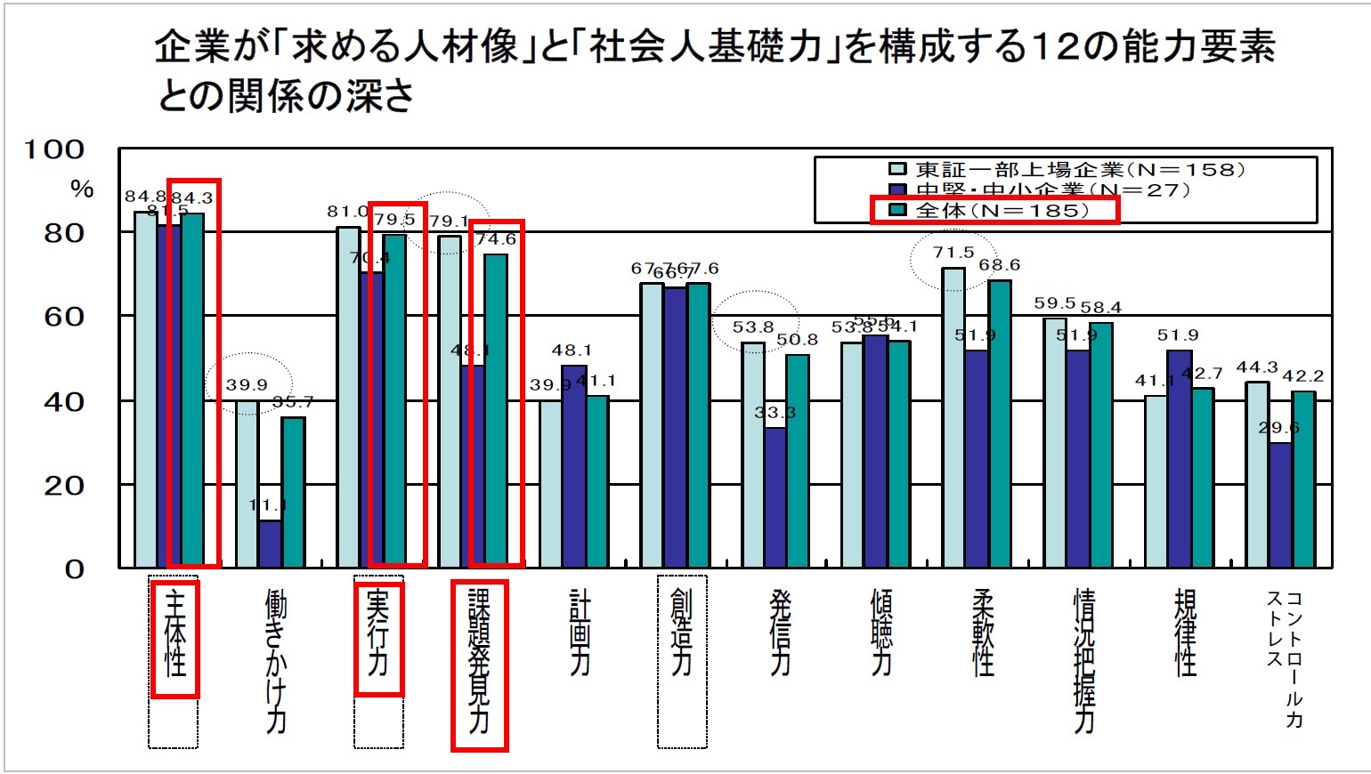 さらに、経済産業省の『社会人基礎力に関する緊急調査(H18年)』でも、企業が求める人材像と関連性の高い社会人基礎力として、主体性・実行力・課題発見力が上位にランクイン。不足が見られる能力との関連でも、主体性と課題発見力が上位にランクインしています。