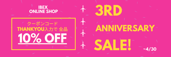 アイベックスエアラインズ(本社:東京都江東区、以下 IBEX) が運営するIBEXオンラインショップは、2023年4月で3周年を迎えます。日頃からのご愛顧に感謝を込めて、全品10%OFFとなる3周年記念SALEを実施します。