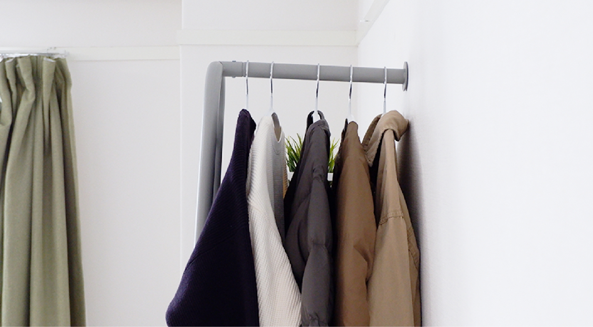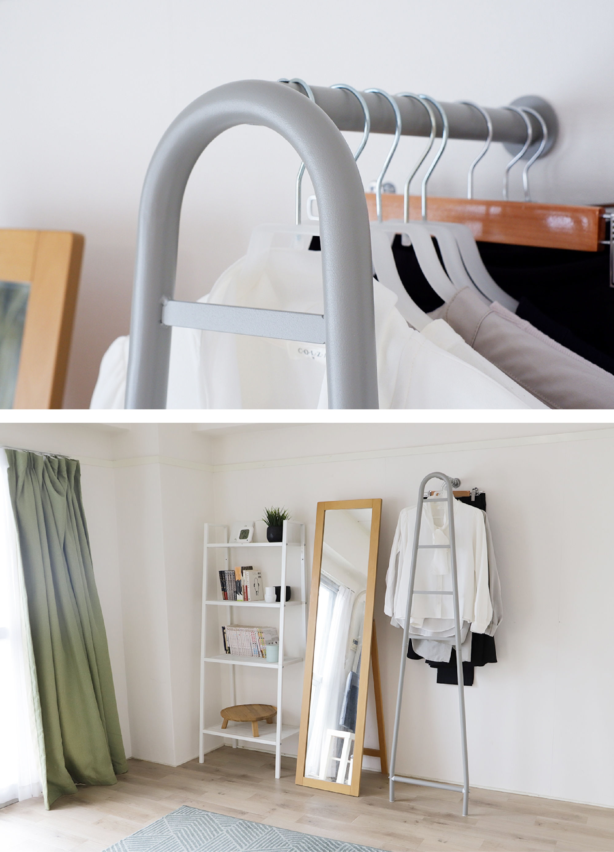 バーは4本配置されているのでトップスとボトムスをあわせて撮影することも可能です。カラーもグレー色なので、主張しすぎず、お洋服をより引き立ててくれます。