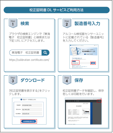 これより本webサービスサイト『校正証明書 DLサービス』でご提供させていただきますのは、お客様にて校正証明書がご入用となった場合、webサイトへアクセスいただき、アルコール検知器の製造番号を入力いただくことで、直ちに校正証明書の電子データをダウンロード・印刷することが可能になります。電話・メールによる当社への校正証明書発行のご依頼は不要になります。また、従来は校正証明書がお手元に届くまで数日を要しておりましたが、本サービスサイトではその場でお客様にて発行いただくことにより、直ちに入手することが可能となりました。