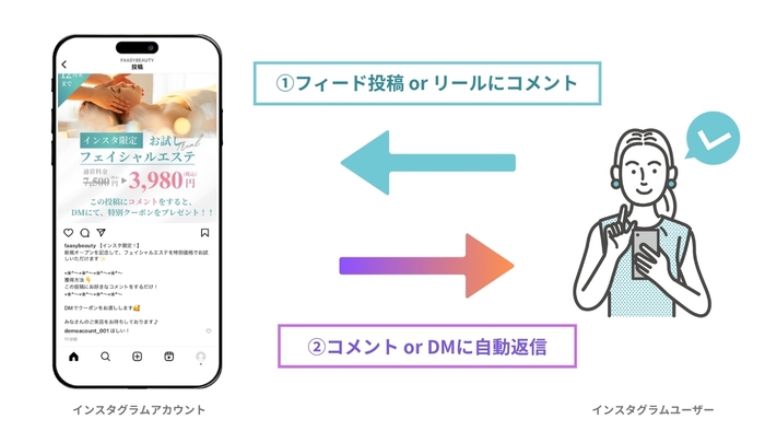 例えば、「サンプル希望」のコメントをくれたユーザーに対して、お申し込みのためのURLを添付したDMを自動送信できます。
