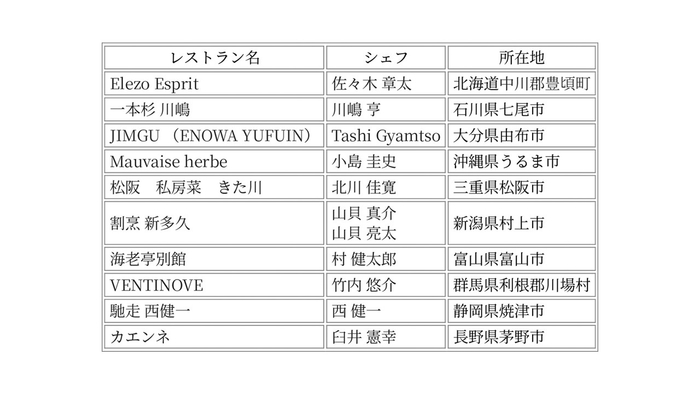 株式会社ジャパンタイムズでは、2021年から日本発信のレストランセレクション「Destination Restaurants List」を発表しています。Destination Restaurants List は「日本人が選ぶ、世界に伝えたい日本のレストランリスト」として発足し、ジャパンタイムズの理念である「日本人の視点で、世界の人々に、日本の姿を伝える」を軸に、食の専門家、フーディーとして名高い、辻 芳樹、本田 直之、浜田 岳文の3氏が選考にあたり、日本各地に点在する訪れるべき10店を毎年選出しています。今年は以下のレストランが選ばれました。