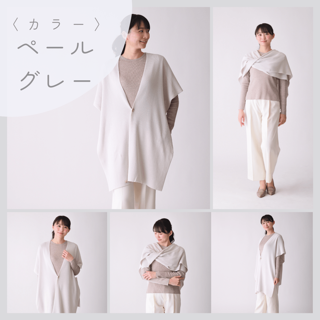 〈ぬくもり纏うアレンジストール〉の魅力は、その変幻自在な着こなしにあります。ボタンを外して広げれば、たちまち上質なストールへと姿を変えます。首元にふわりと巻けば、流れるような美しいドレープが生まれ、顔周りを優しく彩ります。寒さ対策としてはもちろん、コーディネートのアクセントとしても最適です。