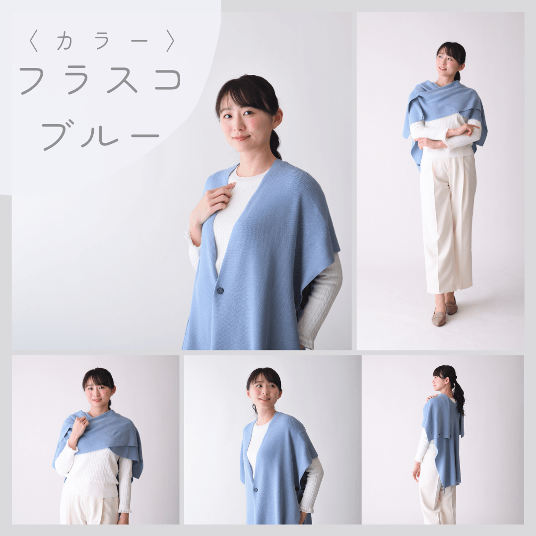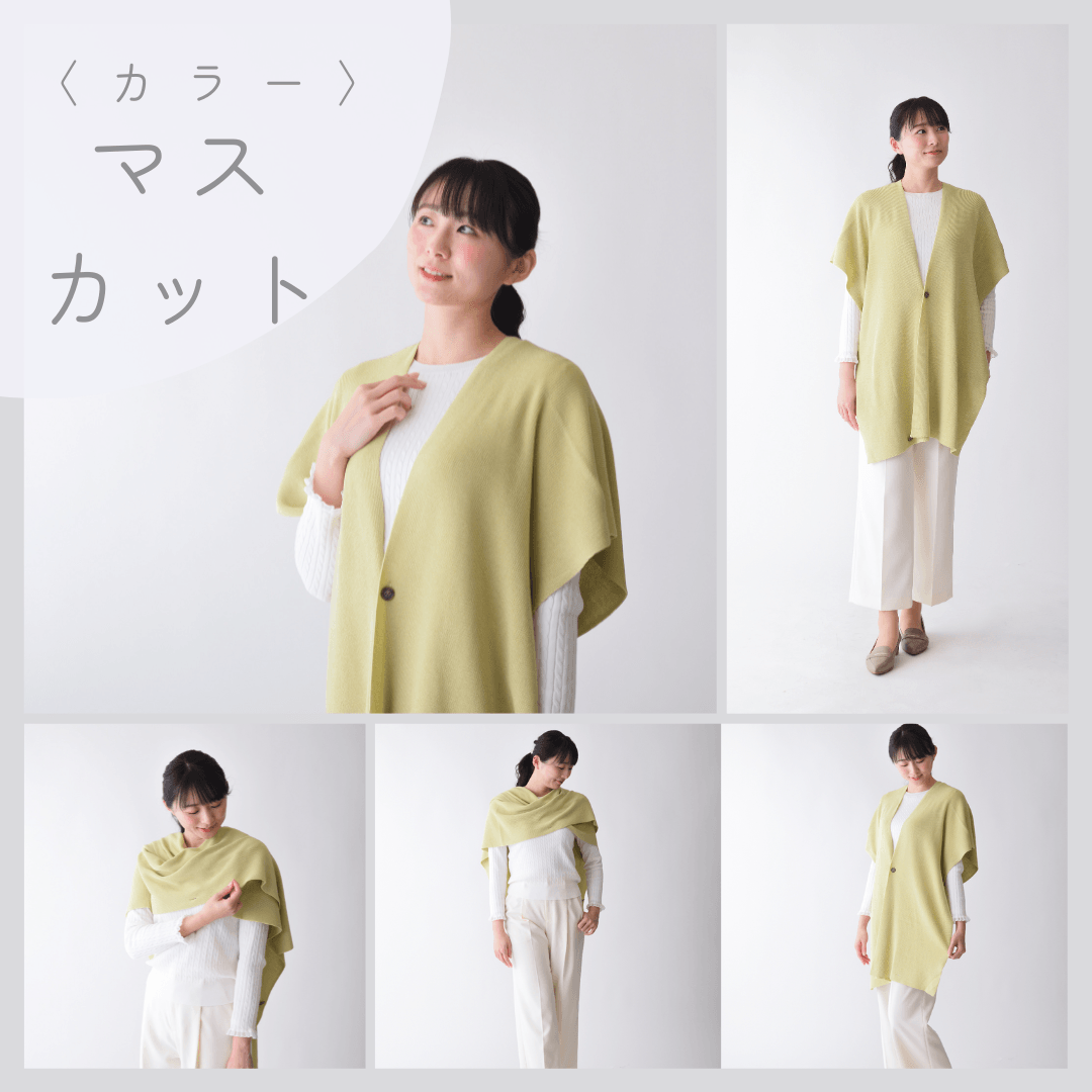 この『ぬくもり纏うアレンジストール』は、4つのカラーバリエーションからお好みの1着を選べ、ストールを少し長めにデザインされたベストとしても包み込むような温かさで工夫を凝らし、高齢者の方々が明るく前向きな気持ちで過ごせるような、ワクワクお出掛けしたくなるような、そんな商品の開発を目指しました。