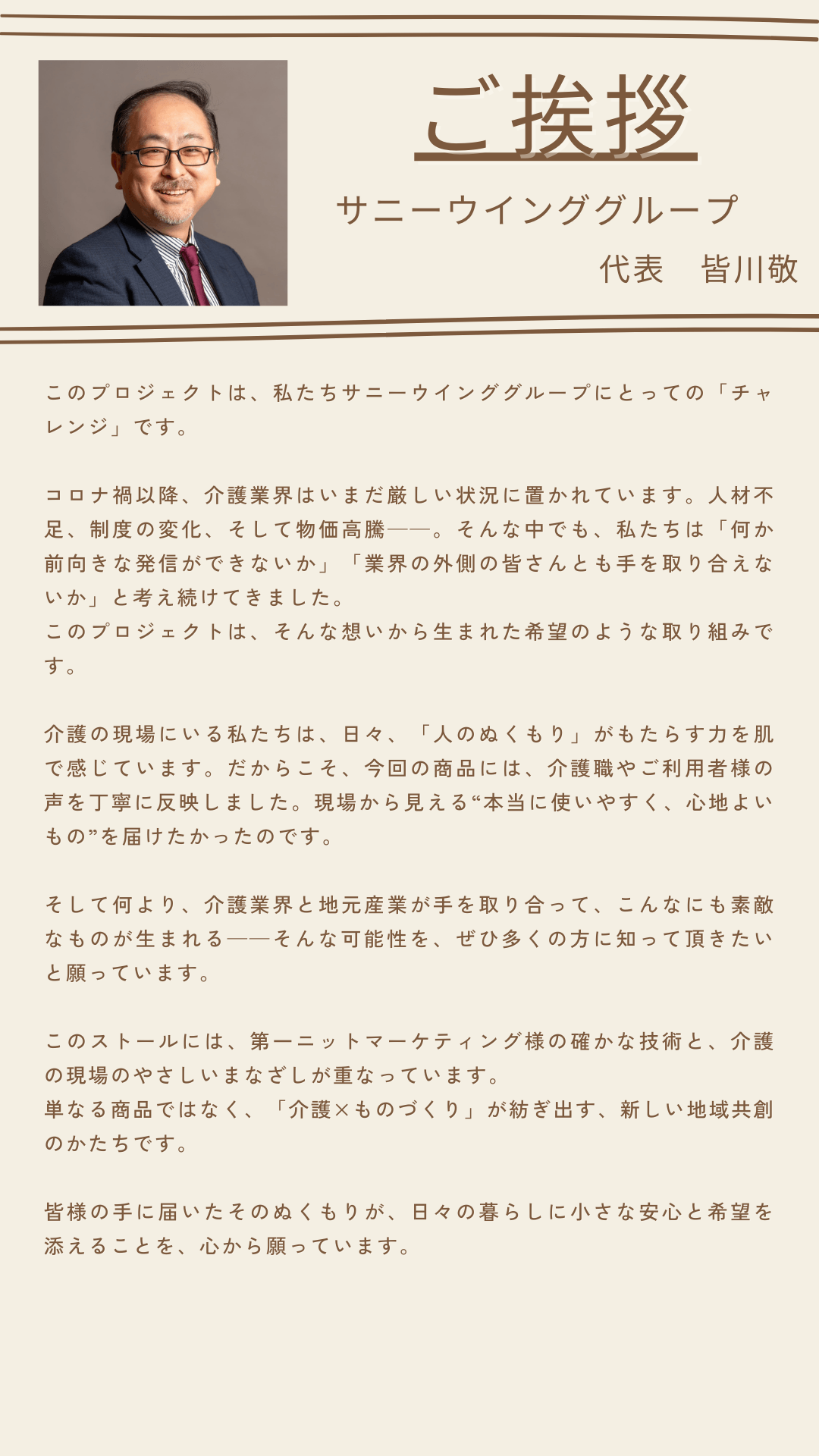 さらに、このような異業種による新たな取り組みは、地元産業の活性化にわずかでも貢献したいとの思いも込められており、高齢化が進む地域において、伝統産業であるニット産業が我々介護事業の会社とコラボレーションすることで、雇用の創出や技術の継承など様々な効果を生み、さらには介護事業との連携を通じて、地域社会全体に新たな活力を生み出す可能性を秘めているのではないかと期待しています。