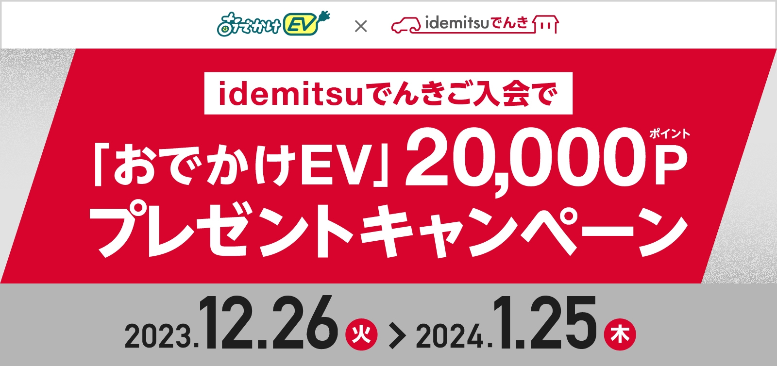 2023年12月26日(火)~2024年1月25日(木)のキャンペーン期間中 、おでかけEVキャンペーンページの【idemitsuでんきご入会で「おでかけEV」20,000ポイントプレゼント】よりお申込いただき、「idemitsuでんき」を新規ご契約(3ヵ月以上)いただいた方を対象として「おでかけEV」20,000ポイントをプレゼントいたします!
