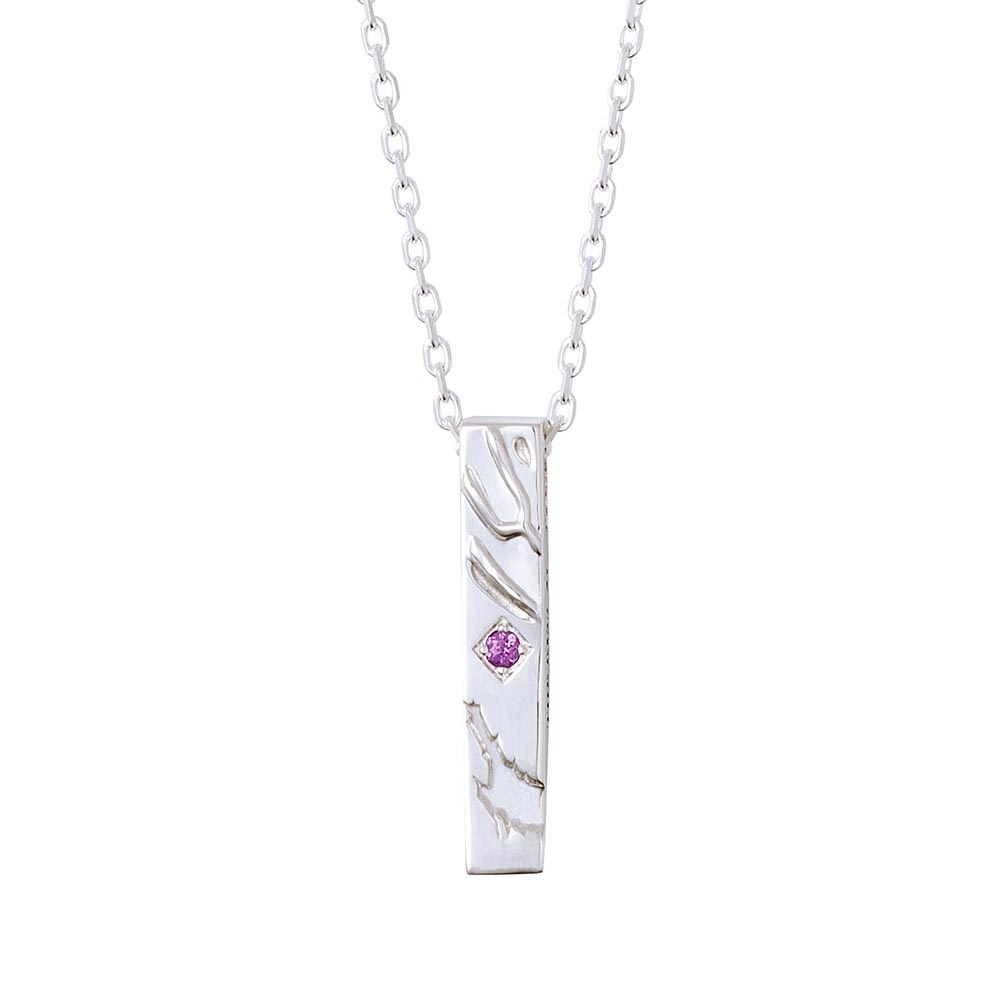 日輪刀の切先のフォルムをさりげなく取り込んだバータイプのトップに、イメージカラーの天然石をセット。