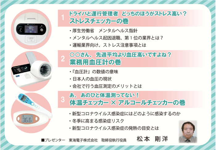 点呼機器およびアルコール検知器を開発・販売する東海電子株式会社(本社:静岡県富士市 代表:杉本 哲也)は、この度、「乗務員の安全・健康を守る新しい3つの健康管理機器」無料オンラインセミナーを開催いたします。