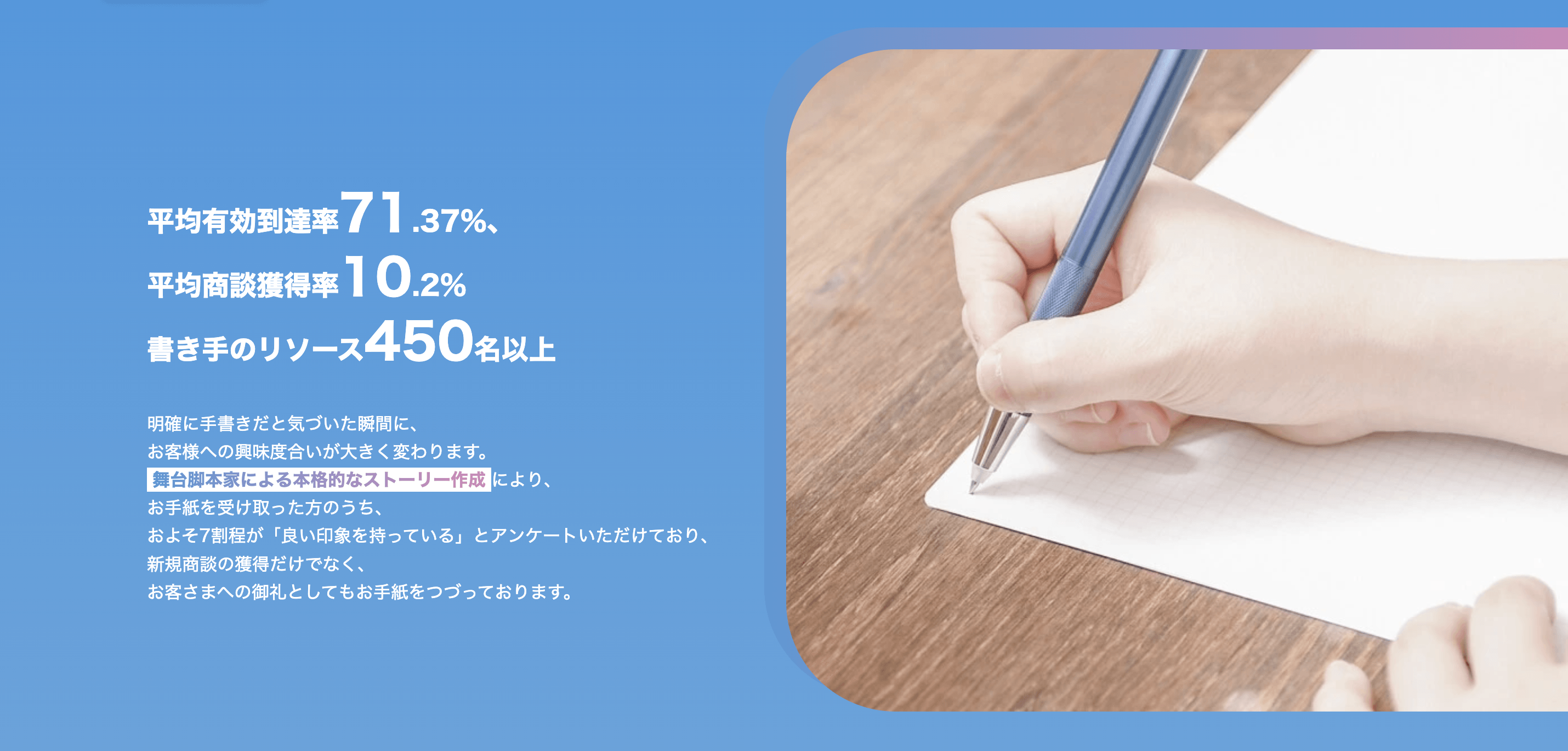 舞台構成作家がストーリーテラーとなり、サービスへの想いやお手紙送付主の人柄を盛り込んだ物語調の文面にすることで、サービスについてはもちろん、送り主に対しても興味を持っていただけるお手紙を作成します。