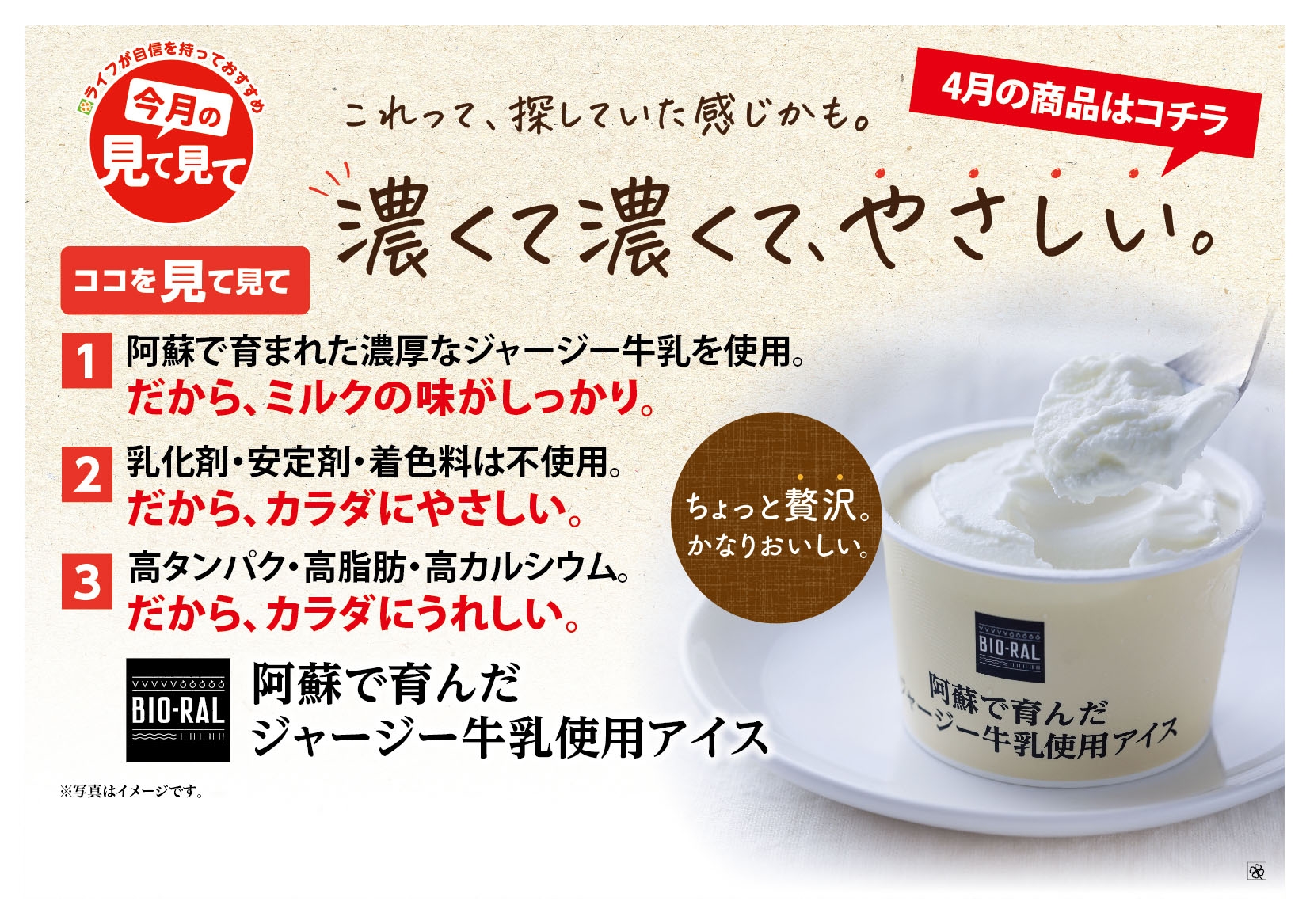 ライフが自信を持っておすすめする「今月の見て見て」の近畿圏4月商品に選ばれた「BIO-RAL 阿蘇で育んだジャージー牛乳使用アイス」は、乳化剤・安定剤・香料を使用せずに作った体に優しい味わいのアイスです。さっぱりとした自然な甘さは、本格的に暑くなる前の今の季節にぴったりです。