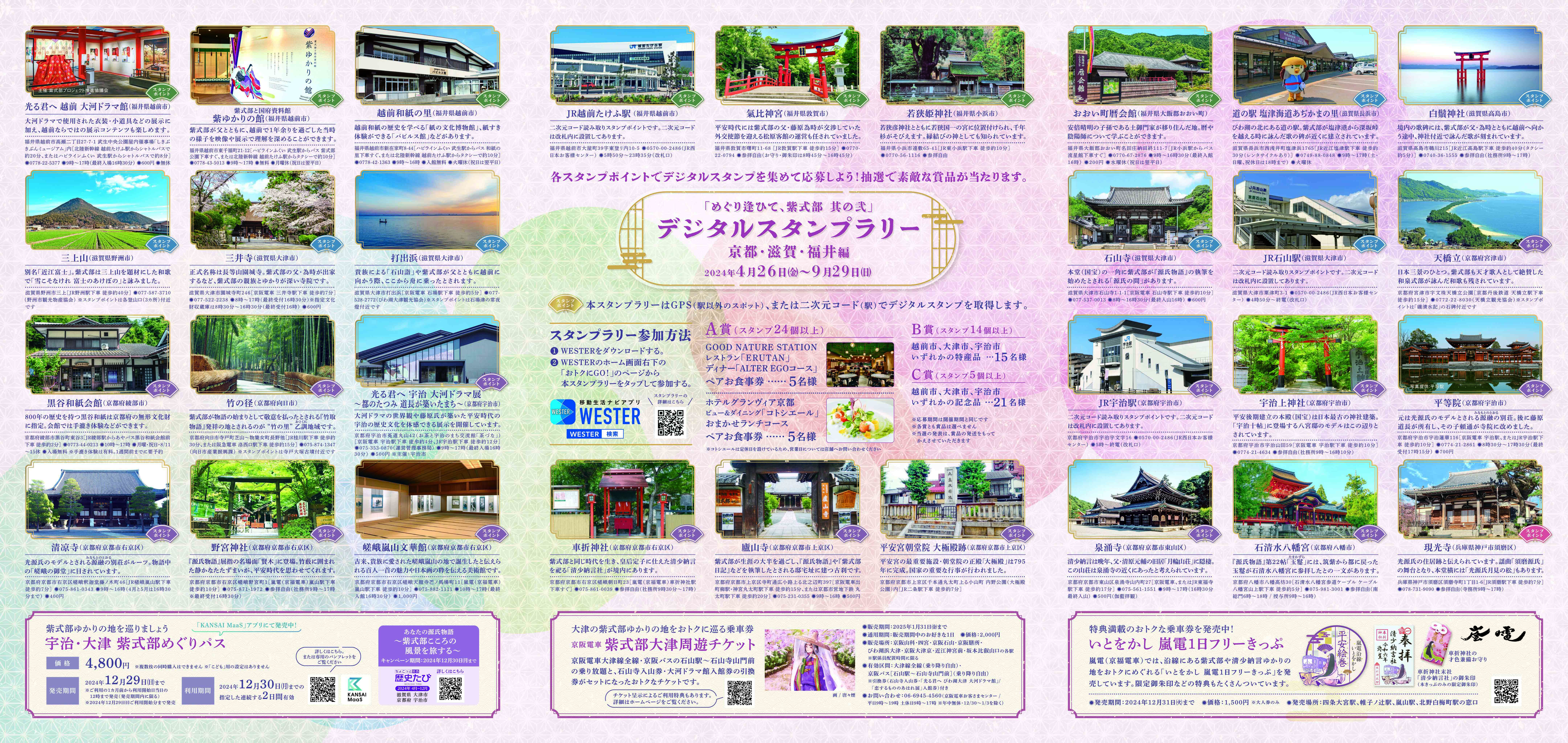 福井県、滋賀県、越前市、大津市、宇治市、公益社団法人京都府観光連盟および西日本旅客鉄道株式会社、京阪ホールディングス株式会社、京福電気鉄道株式会社は、大河ドラマ「光る君へ」の放送を契機に、紫式部の軌跡を追いながら、歴史的な背景を掘り下げ、各地の新たな魅力を発見していく取り組みとして、2024年4月26日(金)から9月29日(日)まで「~平安時代にタイムトラベル~『めぐり逢ひて、紫式部 其の弐』 デジタルスタンプラリー」を実施します。