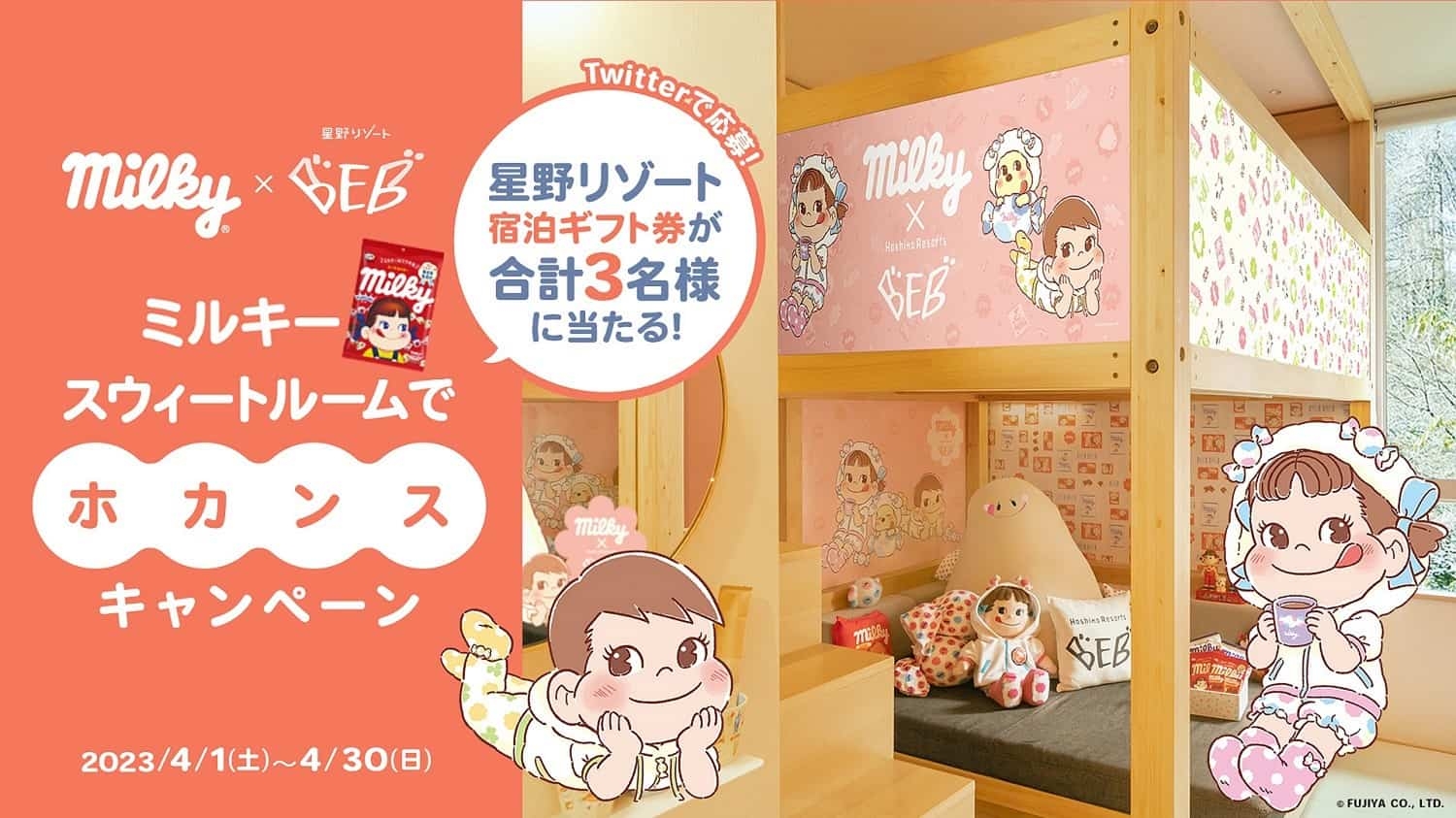 【BEB】不二家 × 星野リゾート BEB コラボキャンペーンを実施!~ミルキーをテーマにした、客室・スウィーツを楽しむ“ベブいホカンス”「ミルキースウィートルームステイ」販売|期間:2023年4月1日(土)~6月30日(金)