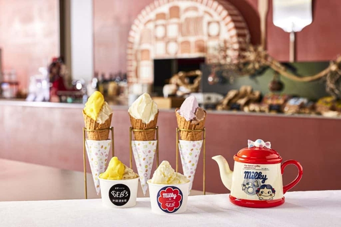 BEB5沖縄瀬良垣は、ミルキー風味のオリジナルジェラートを用意。さらに、可愛いペコちゃんポットに入ったミルキーソースも!ミルキー風味のオリジナルジェラートにかけてミルキー感を増すのもよし、紅芋や島豆腐の味にかけるのもよし。思う存分ミルキーを楽しめます。