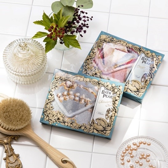 『カドゥメール』のモチーフであるパールをイメージしたような入浴剤「バスパール」は、湯船の中で徐々に溶け出し、ラグジュアリーな香りが広がります。うるおい成分配合で、しっとりなめらかな肌に仕上げてくれます。インカローズの香りのホワイトとオレンジガーネットの香りのピンクの2種類の展開です。