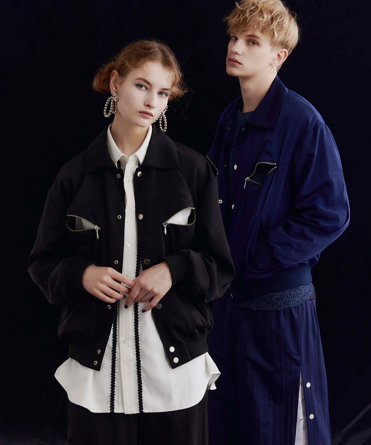 肘にあるホールと胸のファスナーを開けた時にインナーのカラーを見せることが可能なデザインです。