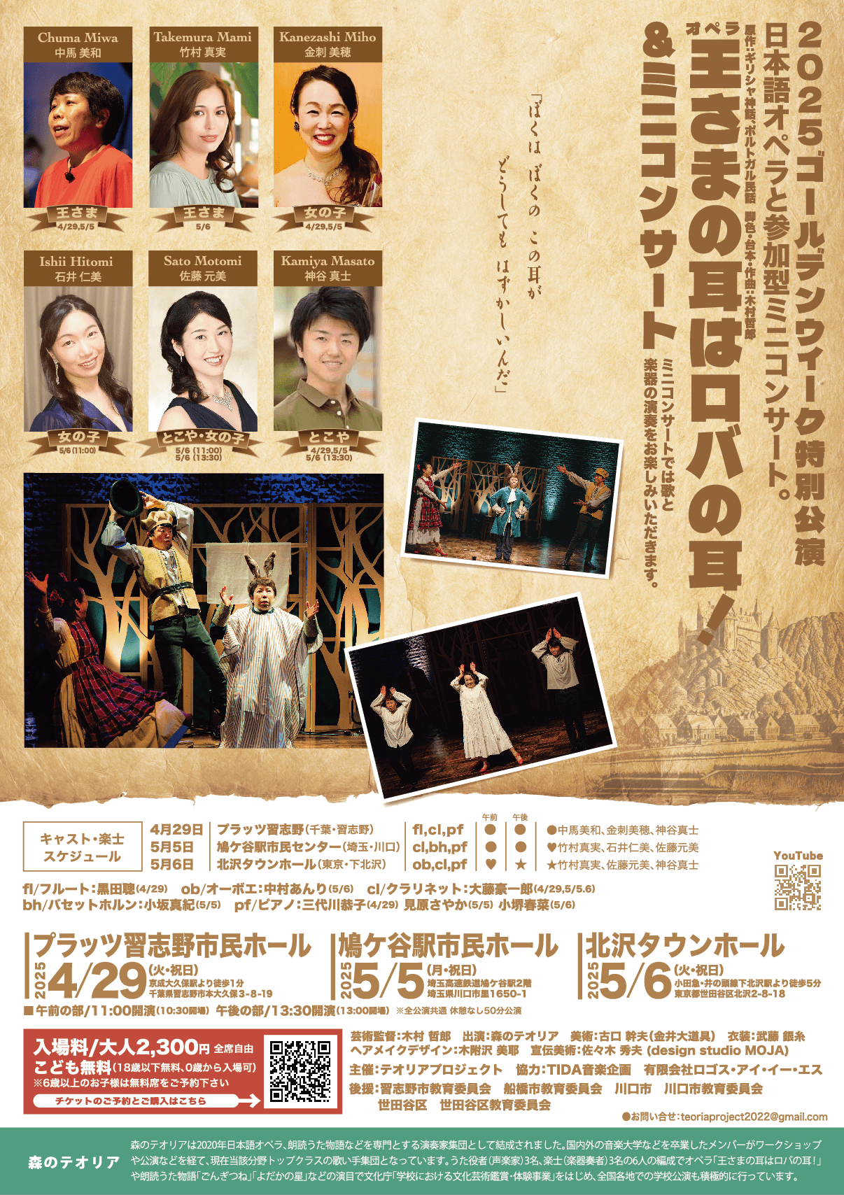 テオリアプロジェクト(所在地:東京都新宿区、代表理事:大藤 豪一郎)は、オペラ「王さまの耳はロバの耳!」&ミニコンサートを、東京・千葉・埼玉にて2025年4月29日(火)より順次開催いたします。