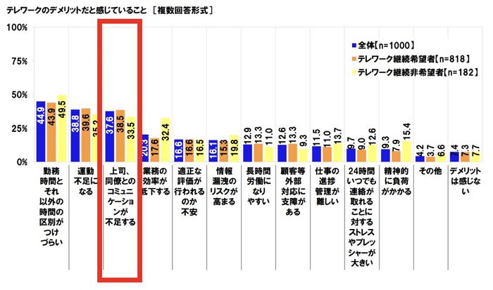 コロナの影響によって、テレワークを導入する企業が増えました。柔軟な働き方ができるようになった一方で、テレワークのデメリットとされているのが、「上司・同僚とのコミュニケーション不足」です。