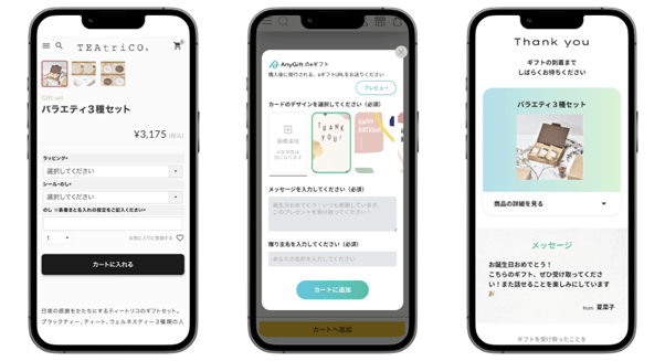 株式会社ティートリコ(本社所在地:静岡県牧之原市、代表取締役:鈴木 稔)はAnyReach株式会社(本社:東京都中央区、代表取締役:中島 功之祐)が提供する『AnyGift(エニーギフト)』を利用したeギフトサービスを「TEAtriCO」にて開始いたします。
