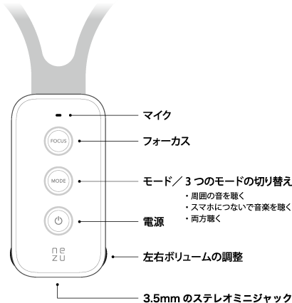 Vibone Nezuの操作は、フロントパネルに配置された3つのボタンと側面の下部に設けられたダイアルで行います。一番下のボタンは電源のオンオフを行うメインスイッチ。真ん中のボタンは①集音機能と②スマートホンなどを接続する外部端末連携機能、③集音機能+外部単滅連携機の3つのモードを切り替えるスイッチ。一番上のボタンは状況に応じてマイク感度が切り替えられるフォーカススイッチ。さらに、筐体の下部には左右それぞれ独立して音量調節ができるボリュームダイアルがあります。
