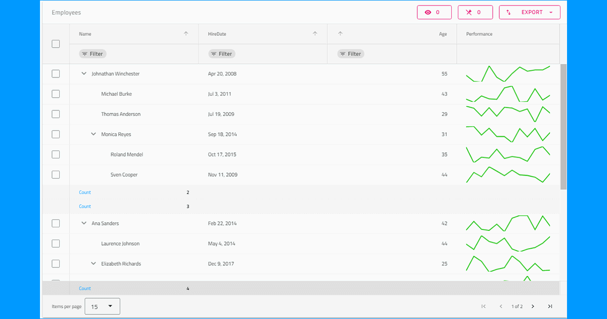 今回のアップデートでは、様々なタイプのアプリケーションに対応するBlazorとWeb Components開発チームのための新しい4種類のグリッド(データグリッド、ツリーグリッド、階層グリッド、ピボットグリッド)が追加され、最高の顧客満足度を実現するために開発者に必要なものを提供しています。さらに、このグリッドは最も負荷の高いデータ要件に対しても期待を上回るように構築されており、ユーザーは自由にデータをコントロールしながら、Microsoft Outlookスタイルの美しい操作感を実現できます。