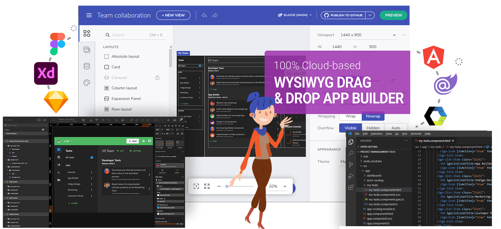 Infragistics App Builder(R)は、Ultimateに搭載されたデータグリッドとツリーグリッドの構成をフルサポートしており、新しい.NET Blazorコード生成機能、Web Components向けの新しいコード生成機能、さらにFigmaで制作したデザインからのコード生成もサポートしています。