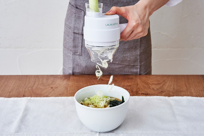 株式会社スマイル(本社:東京都江東区、代表取締役社長:大野 敦)は、暮らしに「楽しさ」や「楽(ラク)」をプラスする生活家電ブランド「LALALUCTUS(ラララクタス)」にて、食材を包丁やまな板を使わずにスライスでき、チョッパー機能も備えた「コードレス電動スライサー&チョッパー」を2023年9月28日(木)に発売いたします。ネギやキュウリなどの細長い野菜だけでなく、にんにくのような小さい野菜もボタン一つで簡単にスライスでき、混ぜる・刻むなどのチョッパーとしても使える2WAYタイプの調理家電です。