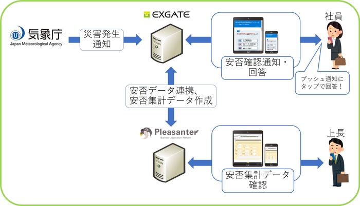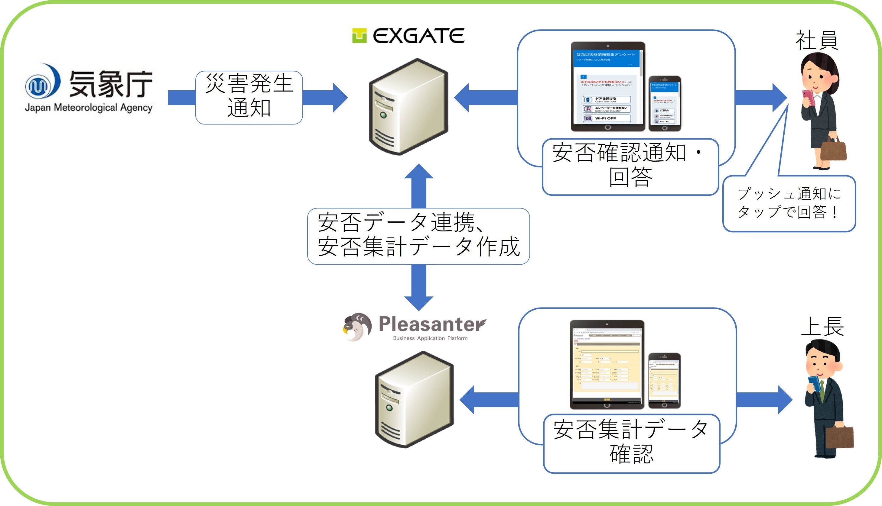 気象庁の情報を基にEXGATEによるPUSH通知発信、使い慣れた社内のグループウェアと連携、またプリザンターを利用して次のアクションを行うためのデータの集計をタイムリーに行え、カスタマイズにも柔軟に対応できます。