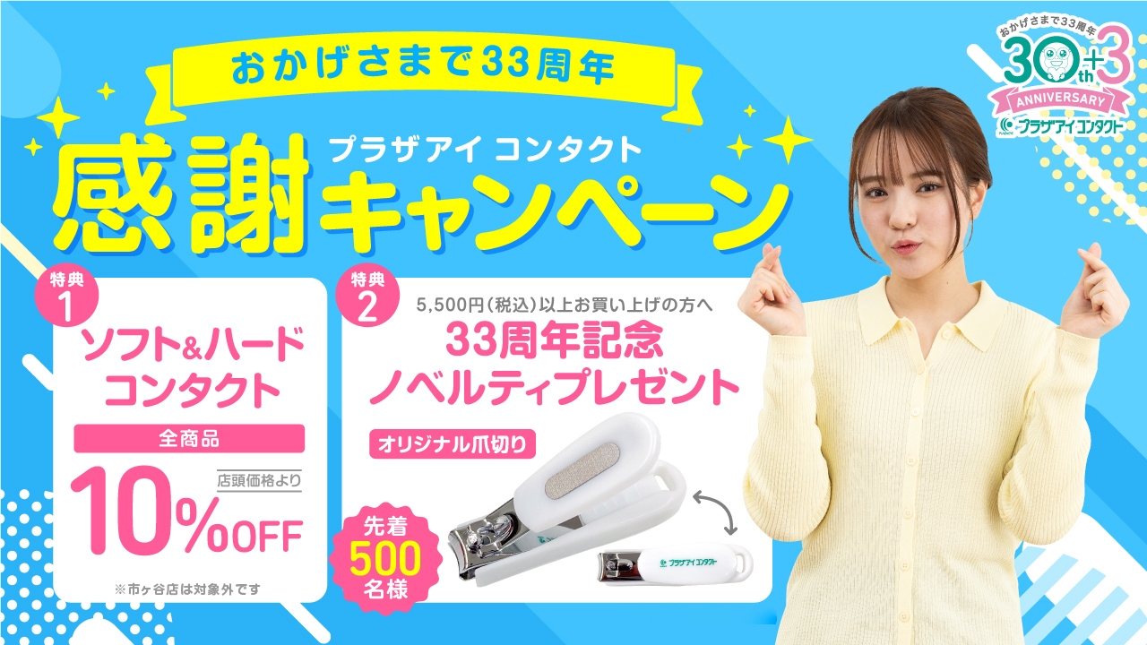 株式会社プラザアイ(代表取締役:小倉 信典)は、コンタクトレンズ専門店のプラザアイ コンタクトの33周年を記念して、「おかげさまで33周年 感謝キャンペーン」を2025年7月31日(木)まで開催いたします。