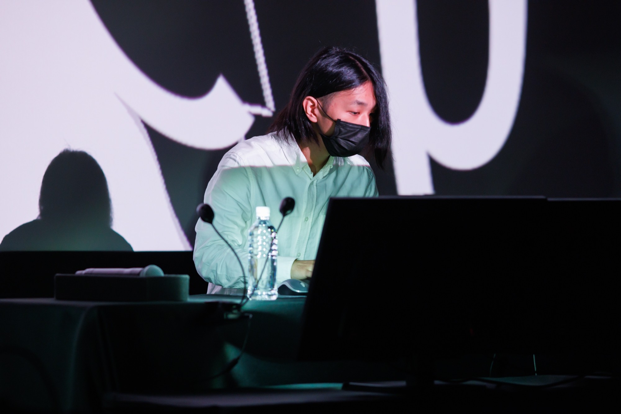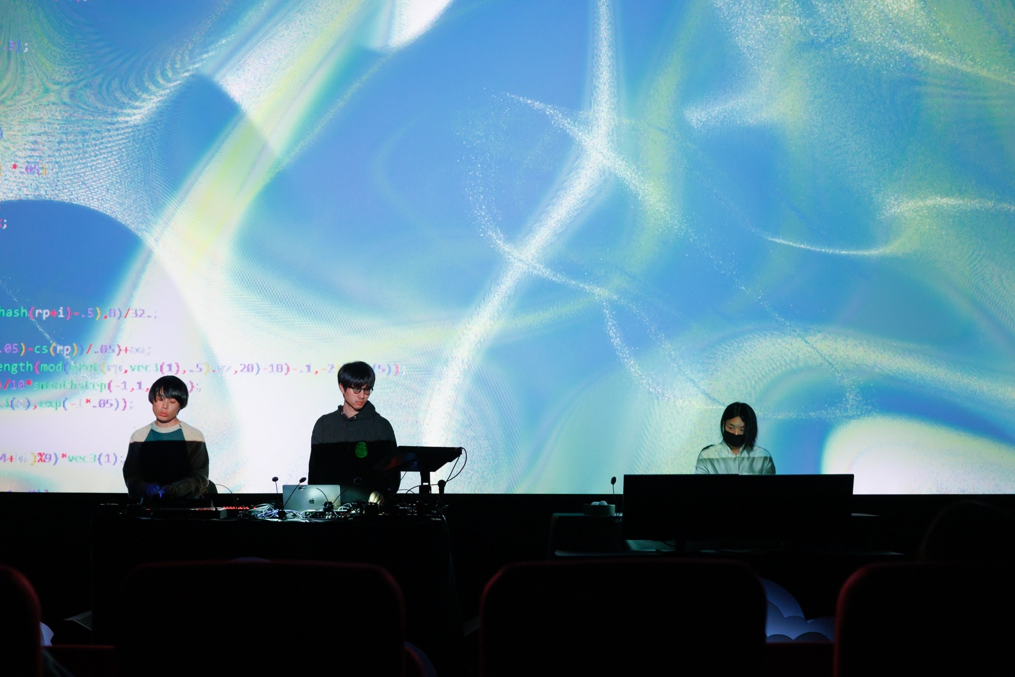 また、ライブコーディングVJとの共演が今回初となるパソコン音楽クラブの2人は、「昨日のリハーサルで、Renardさんが楽器を演奏するようにキーボードを触り、音楽に合わせてどんどん映像を変えていくのを見て、本当に一緒にセッションしている感覚になって。今日がすごく楽しみです(西山真登氏)」「映画館では映像がめちゃくちゃ鮮明に映し出される。クラブなどでは滅多に実現できないことなので、とても惹き込まれると思います(柴田碧氏)」と、観客の期待を盛り上げました。